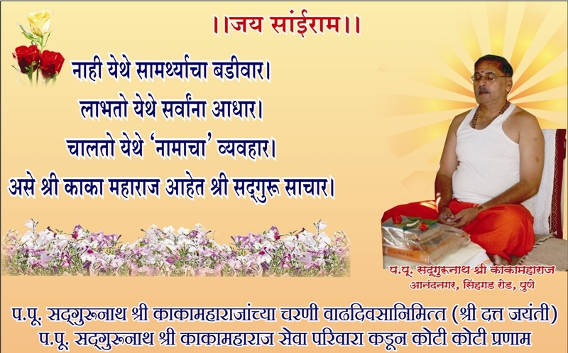 our P Pu. Sadgurunath Shri Kaka Maharaj's birthday, is a very important day for all of us. Shri Sadguru's birthday falls on same day as "Dutta Jayanti". P. Pu. Sadgurunath Sewa Parivar celebrated this auspicious week by reciting "Guru Charitra", Naam sadhana and by offering prayers. As a promotional activity, Trust offered their wishes to Shri Sadguru through News paper and Television Channels.